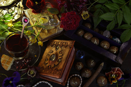 Still life with magic book of spells, runes and cup on witch ritual table. Occult, esoteric and witchcraft concept. Mystic background with vintage objects
