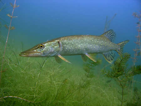 Pike underwater shot in a lake taken while scuba diving showing the fish in its natural habitat