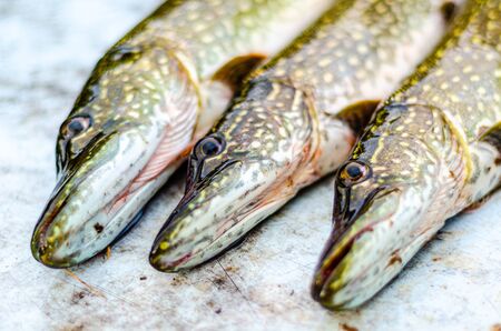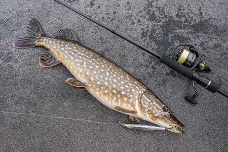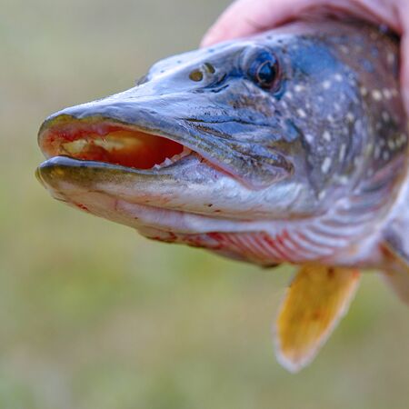 Freshwater Northern pike fish know as Esox Lucius. Fishing concept, good catch - big freshwater pike fish. Pike head with bait closeup.