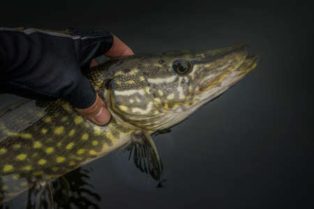 Portrait of Northern Pike (Esox lucius). This is a species of carnivorous Freshwater Fish of the genus Esox Clos up of head of fish. Wildlife Scene of Nature in Europe.