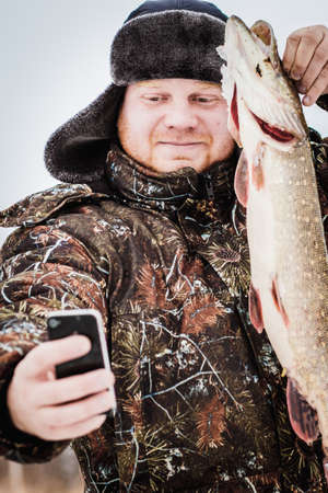 Big northern pike Esox lucius. winter fishing. Fishing trophy. Copy space