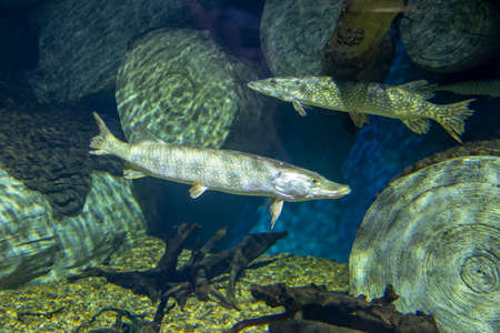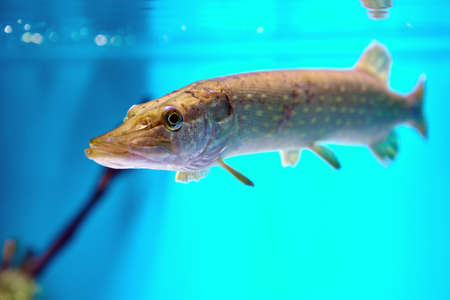 Pike fish in aquarium or reservoir ubder water on fish farm
