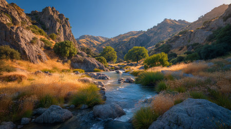 Serene Mountain River Landscape with Golden Grass and Clear Blue Sky