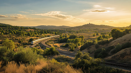 A scenic view of a train gliding along a curved track, surrounded by lush landscapes and vibrant trees during sunset, capturing the essence of travel and nature.