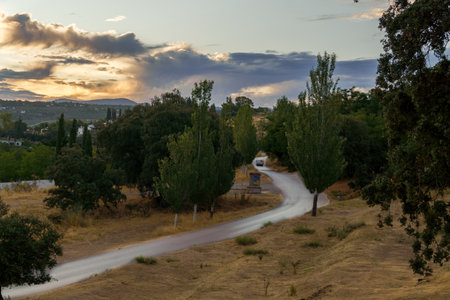Scenic view of a white car driving on a winding road through a tranquil countryside landscape at sunset