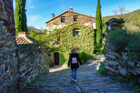 Tourist woman strolling through the streets of the picturesque stone village, Patones de Arriba.