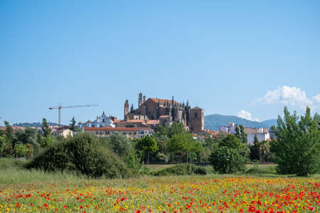 A meadow full of beautiful red poppies and beautiful yellow daisies during spring and in the background the city of Plasencia with its cathedral