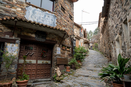 Narrow stone street with rustic buildings and greenery.. Pueblo de Patones de Arriba in Madrid, known for its slate architecture and for evading the French invasion., plants