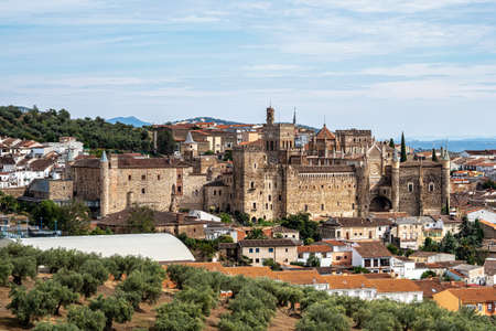 Facade of Santa Maria la Mayor Church and steeples in front of garden with trees at Trujillo. A small medieval town, birthplace of the Conquistador Francisco Pizarro in western Spain.