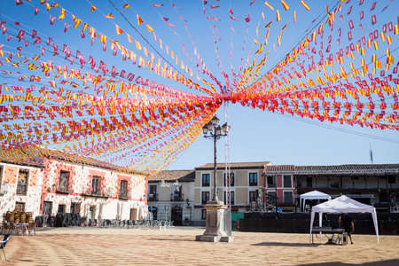 Trujillo, Spain - July 04, 2018. Cityscape with old buildings and steeple in the Plaza Mayor of Trujillo. A small medieval town, birthplace of the Conquistador Francisco Pizarro in western Spain.