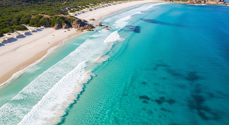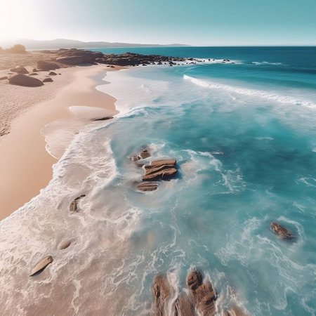 Keywords: showing expansive white sand beach with rolling turquoise waves and rocky outcrops under a clear blue sky aerial view keywords: aerial,...