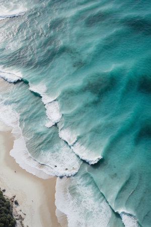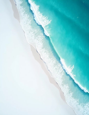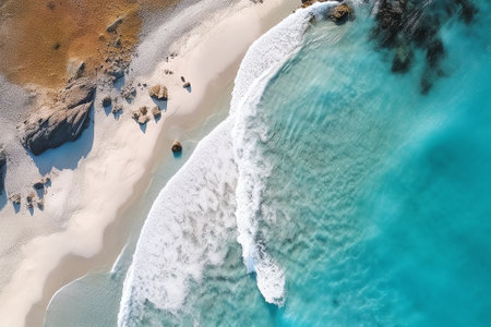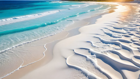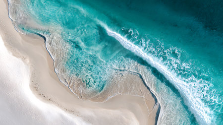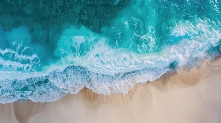 High-angle perspective showcasing turquoise ocean waves meeting pristine white sand creating a captivating beach scene. The textures of water and sand provide visual interest.