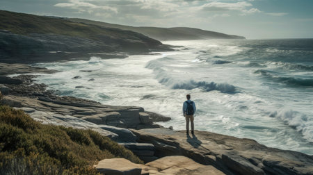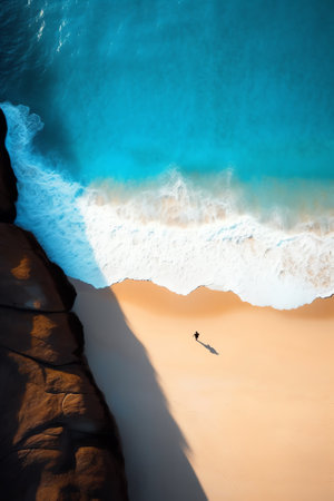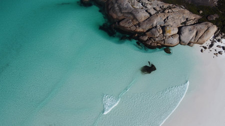 Generative AI : Aerial view of a person along the shoreline at Wylie Bay coastline Esperance Australia