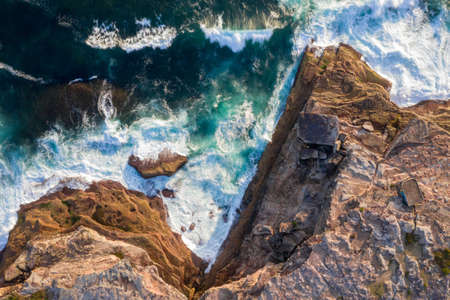 Aerial View of the Ocean From a Cliff, Top view of fascinating rock formations among frothy oceanic waves, AI Generated