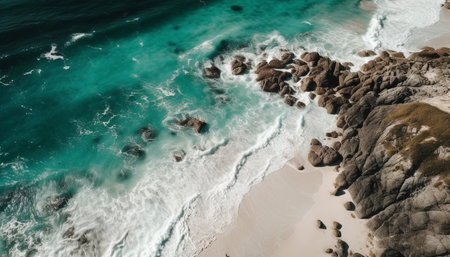 Breathtaking aerial view of turquoise ocean waves crashing against a dramatic rocky coastline cliff. Ai generated image