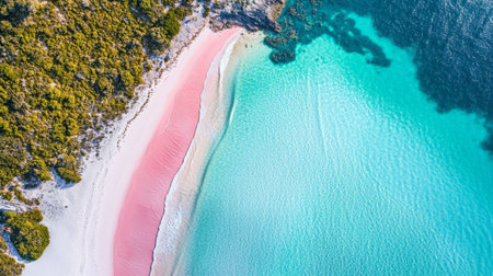 A stunning aerial view of a serene pink sand beach surrounded by clear blue water. This tropical paradise captures the essence of relaxation and beauty.