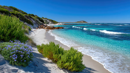 Discover a stunning coastal scene showcasing gentle waves, soft sand, vibrant flowers, and lush vegetation under a bright blue sky, perfect for relaxation and exploration.