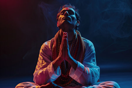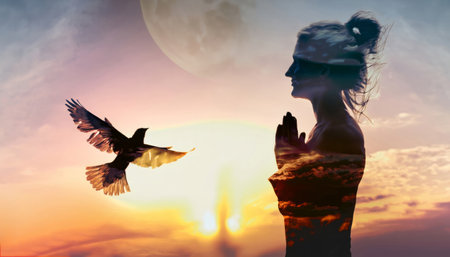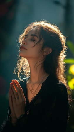 Concept photo of a person standing in the moonlit garden, their eyes closed and palms pressed together in prayer, as if communing with the divine