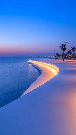 Photo - Coastal Walkway Sunset, Ocean, Architecture, Cityscape, Dusk, Palm Trees, Illuminated Path, Twilight, Tranquility, Serene
