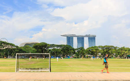 Singapore-05 MAY 2018: Football field big lawn near Singapore marina bay area
