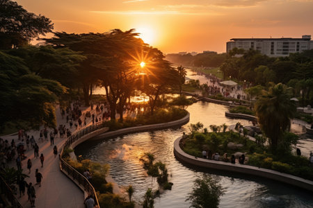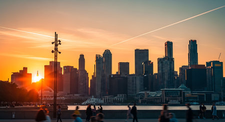 A bustling cityscape at sunset, with silhouettes of people walking along a waterfront promenade, modern skyscrapers reflecting the warm glow of the sun