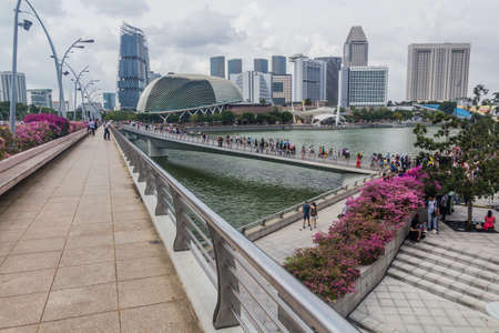 SINGAPORE, SINGAPORE - MARCH 11, 2018: Esplanade bridge and panorama of the Marina Bay, Singapore