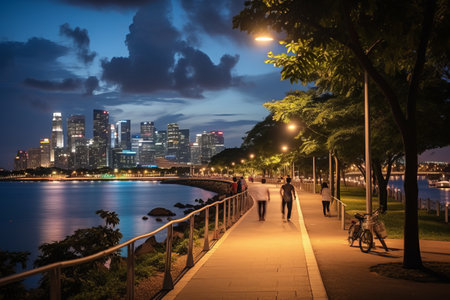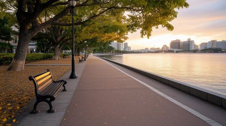 Scenic riverside promenade with park benches and city skyline at sunset. Relaxing urban environment