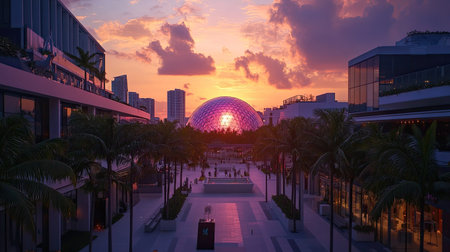 Buckminster Fulleraes Flyaes Eye Dome at sunset, casting shadows over the Miami Design District, with high-end boutiques and art installations in view