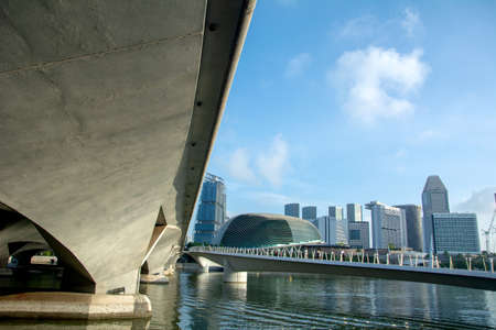 Singapore - January 16, 2020 : View of Esplanade Theaters and other buildings in Singapore city centre. View from under the bridge