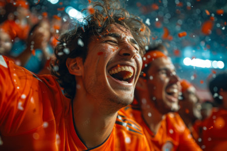 Cheerful fans cheering for their favorite team during a soccer match.