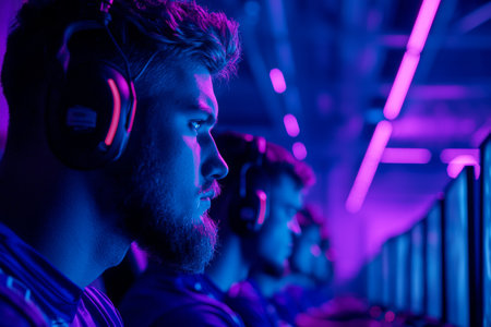 Cyber sportsmen participating in important match at gaming club