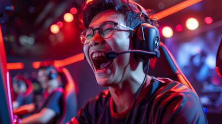 Young professional gamer shouts in excitement during a gaming competition