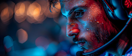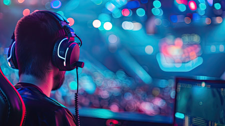 Professional gamer playing tournaments online video games computer with headphones, red and blue