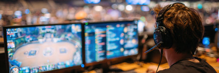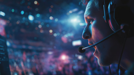 A professional esports commentator wearing headset focused during intense gaming tournament event