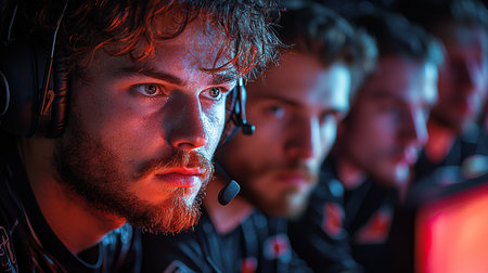Team professional gamer playing tournaments online games computer with headphones, red and blue