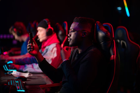 Multiracial team of professional cybersport gamers wearing headphones participating in global eSport tournament, playing online video games, side view