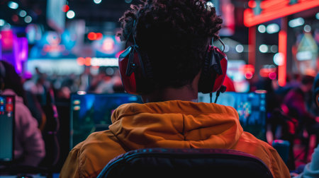 Esports gamer focused on betting interface, immersed in gameplay at a competitive gaming event surrounded by vibrant atmosphere and other players