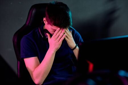 Professional gamer playing online games tournaments pc computer with headphones, Blurred red and blue background