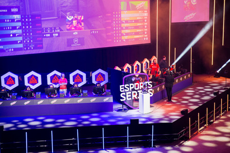 MOSCOW, RUSSIA - 14th SEPTEMBER 2019: esports Counter-Strike: Global Offensive event. Players booth with team Ninjas in Pyjamas legend Christopher GeT RiGhT Alesund inside on a stage.