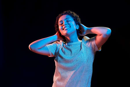 african american woman dancing over neon lights