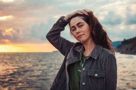 Portrait of a smiling woman combing her hair with her hand. In the background is a dramatic sunset. The concept of psychology and mental health.