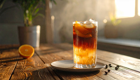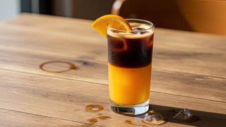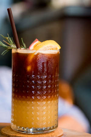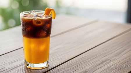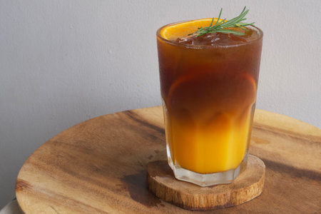 A glass of iced coffee with orange juice on wooden table