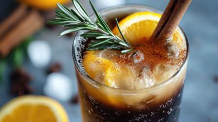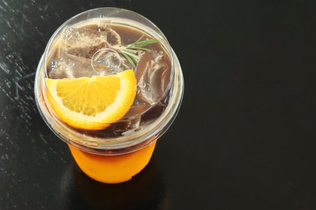 A close-up of iced Americano black coffee with citrus layers of orange and lemon juice, topped with rosemary and cinnamon, perfect for a refreshing drink shot.