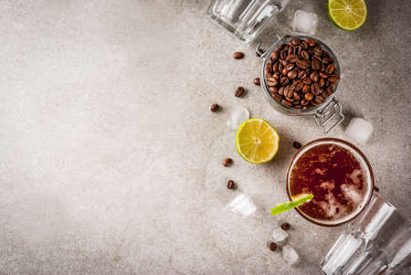 Espresso Tonic, refreshment summer drink with tonic water, lime and coffee, grey stone table, copy space top view