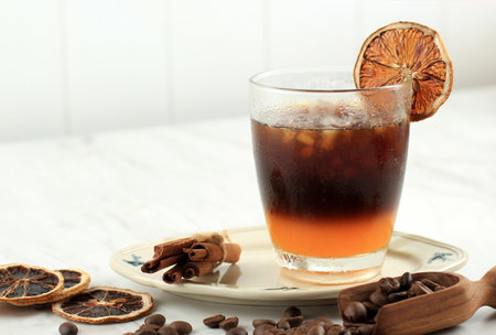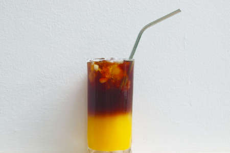 A glass of ice black coffee and orange juice