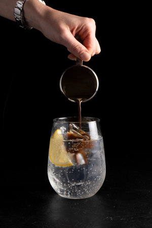 Girl bartender prepares a cocktail and pours coffee into an espresso tonic. Cold alcoholic cocktail of coffee and a refreshing tonic in a transparent glass on a black background.