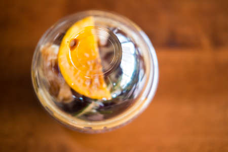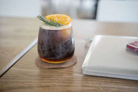 Iced coffee with orange in a glass on a wooden table.