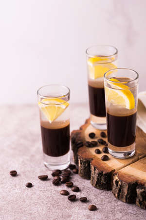 Alcoholic shot cocktail silver bullet with gin, coffee chocolate liqueur and lemon. White wooden background. Horizontal view. Copy space