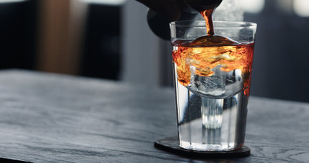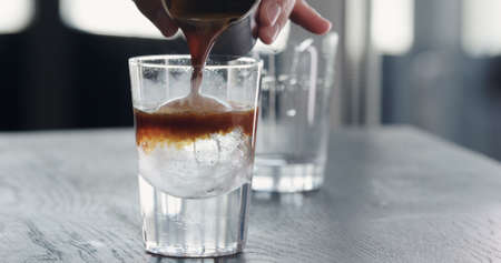 Bumble cold refreshing coffee drink with freshly squeezed orange juice, espresso and ice in the making. Pouring black coffee into the glass filled with juice and ice. Summer Cocktail, Cold brew coffee or black tea, Pouring cold drink.
