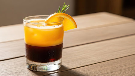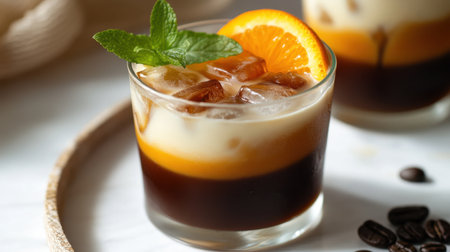 Iced fresh orange juice topped with espresso. Ice cold summer drink. Close up.